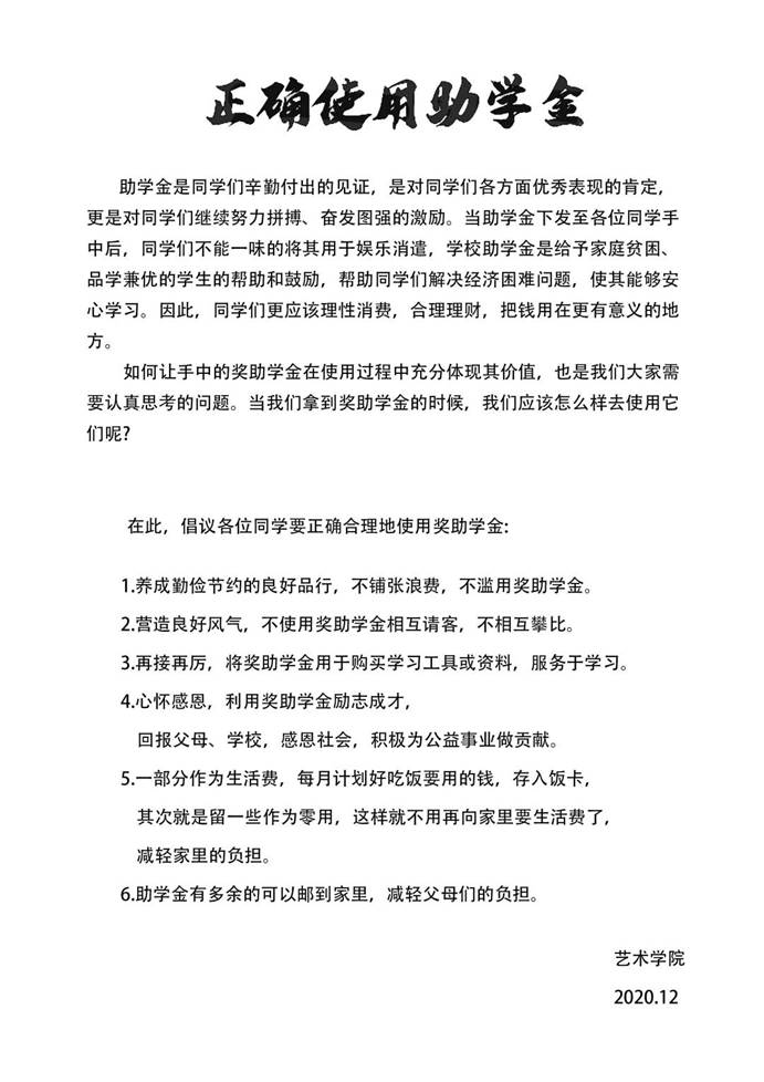 当助学金下发至各位同学手中后,同学们不能一味的将其用于娱乐消遣,学校助学金是给予家庭贫困、品学兼优的学生的帮助和鼓励,帮助同学们解决经济困难问题,使其能够安心学习。因此,同学们更应该理性消费、合理理财,把钱用在更有意义的地方。